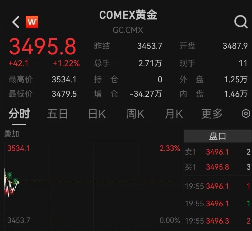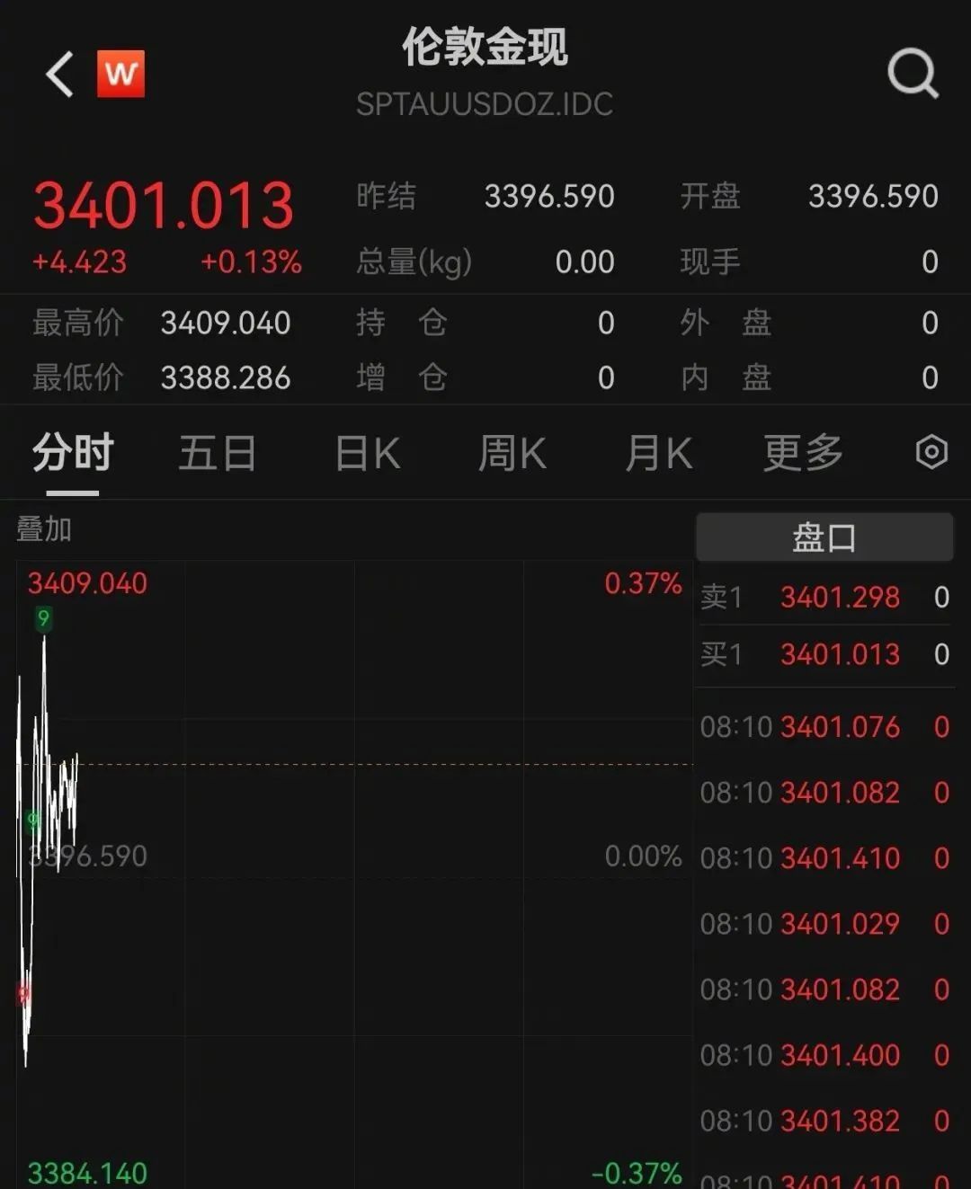 8月8日,国际金价延续前日上涨趋势。截至8:10,伦敦现货黄金一度突破3400美元关口,最高涨至3409.04美元/盎司;COMEX黄金一度突破3500美元关口,触及每盎司3534.10美元的记录新高。
